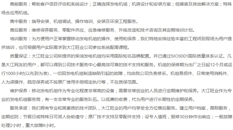 大江旺業提供各種型號規格小型發電機組銷售、出租、維修、保養及安裝服務,信譽保證,價格公道,歡迎新老客戶來電咨詢。